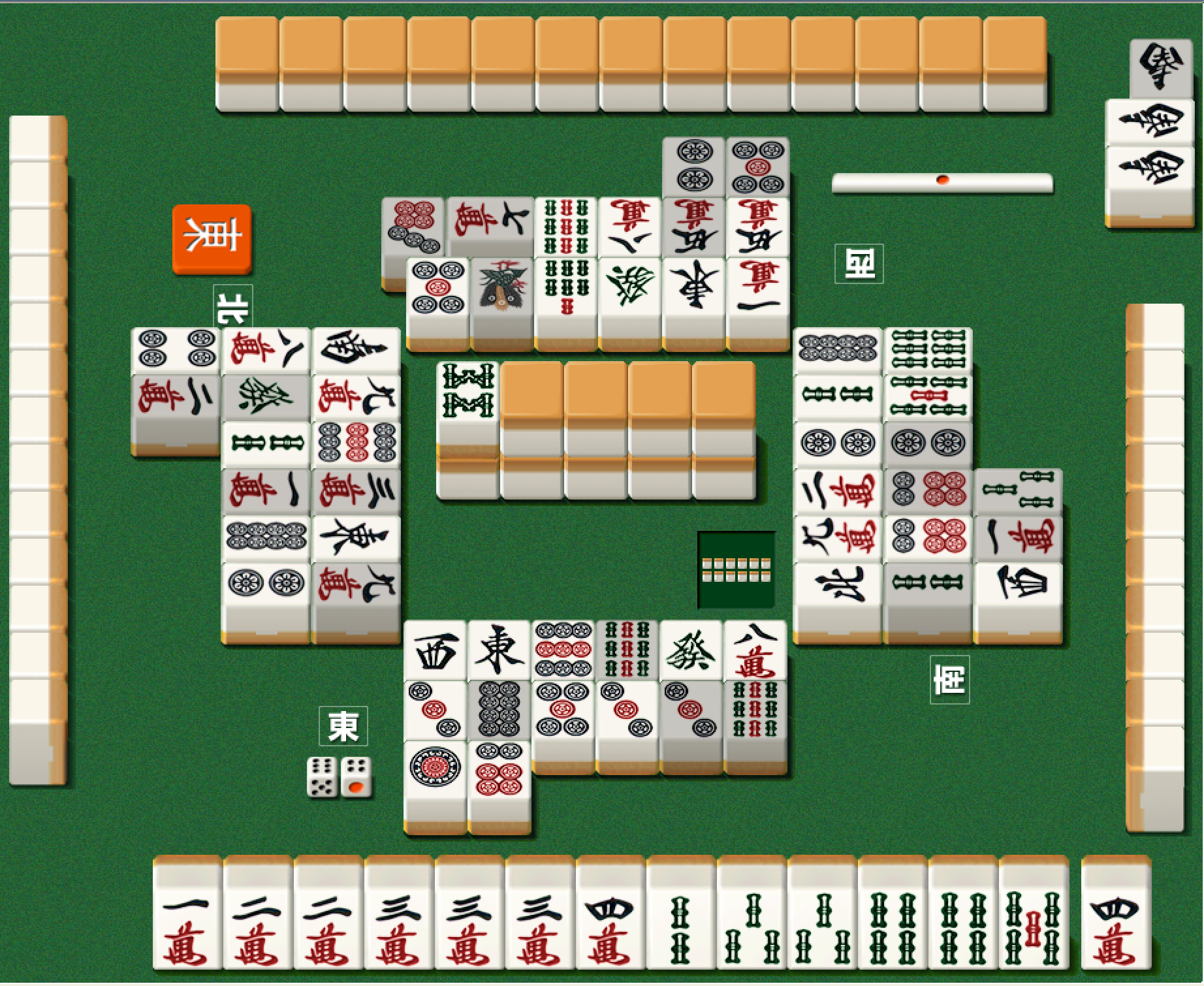 If you wanted to be real crazy, you could imagine that there was some opportunity for seven pairs but at this late stage of the hand I would not recommend that. Priority should be taking tempai and staying East.